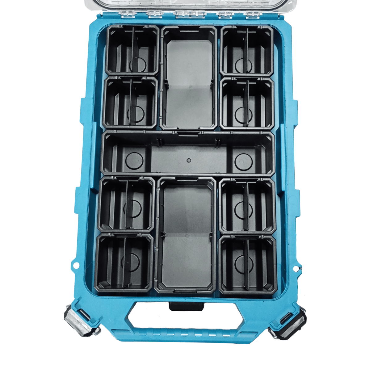 Fabricada dentro dos padrões oficiais de qualidade Makita, esta organizadora conta com tampa transparente, que facilita a identificação rápida do conteúdo, e design interno com nervuras, garantindo que os recipientes permaneçam firmes durante o transporte. Seu interior é extremamente versátil, com 11 compartimentos organizadores removíveis, divisórias ajustáveis e variedade de tamanhos de recipientes, permitindo acomodar desde peças pequenas até componentes maiores com total eficiência.