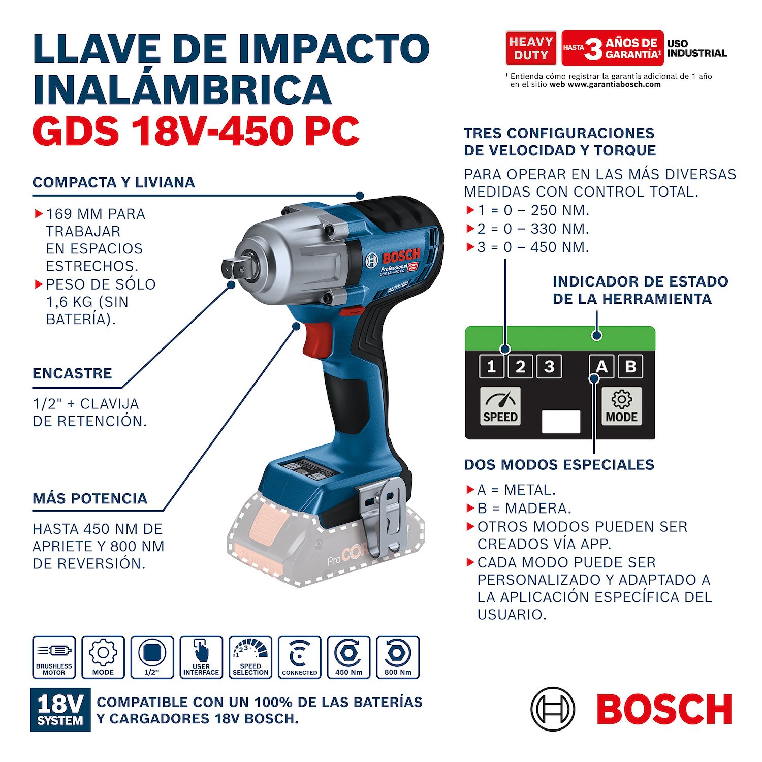 A Chave de Impacto 18V GDS 450 PC Bosch foi projetada para oferecer alto desempenho, controle avançado e máxima confiabilidade em aplicações profissionais. Com um torque de aperto de até 450 Nm e impressionantes 800 Nm de torque de partida, ela é ideal para trabalhos pesados em oficinas mecânicas, manutenção industrial, montagem de estruturas metálicas e serviços automotivos.