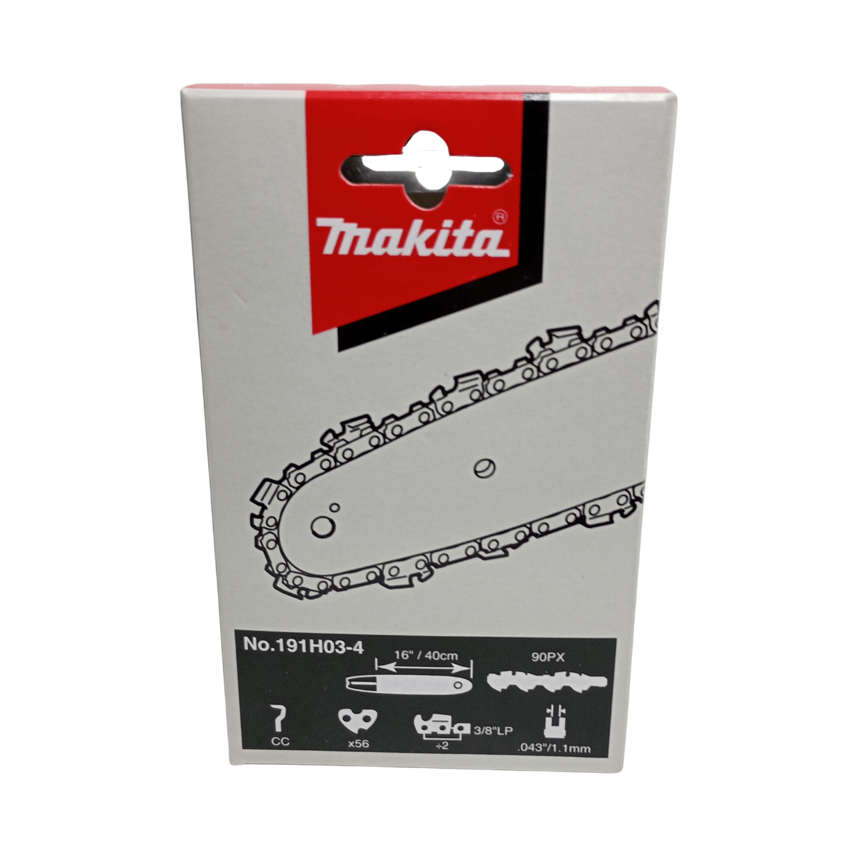 Fabricada segundo os padrões originais da marca, a corrente possui passo 3/8" LP, calibre 1,1 mm (0.043") e 56 elos de tração, oferecendo encaixe exato e compatibilidade assegurada com modelos Makita que utilizam esse conjunto de especificações. Seu design de perfil baixo (low-profile) e de baixo recuo (low kickback) contribui para reduzir vibrações e tornar o corte mais estável, ao mesmo tempo em que os elos com cantos de corte duplos proporcionam eficiência e durabilidade prolongada.