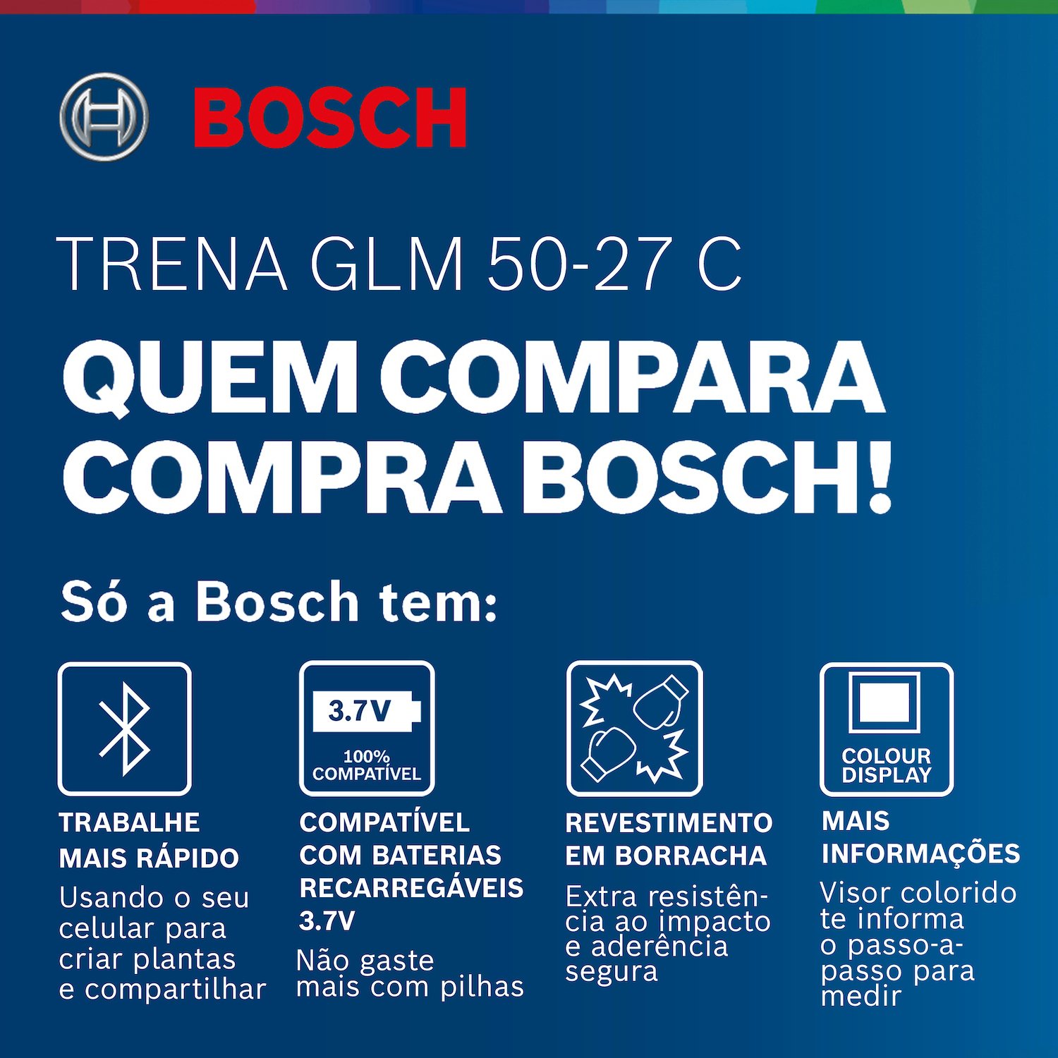A trena laser GLM 50-27 C Professional oferece um design altamente resistente que desafia condições complicadas, permitindo um rápido armazenamento e facilidade de uso. Ideal para canteiros de obras exigentes, com design com certificação de proteção IP65 para absorção de choque, resistente a quedas de 1,5 metros, mesmo em concreto duro. Graças à rápida transferência de dados via conectividade Bluetooth® e ao aplicativo Bosch MeasureOn nunca foi tão fácil documentar os resultados de medição. O manuseio intuitivo é assegurado por sua interface de usuário inteligente com muitos recursos úteis, como um display a cores de última geração e uma função de ajuda útil.