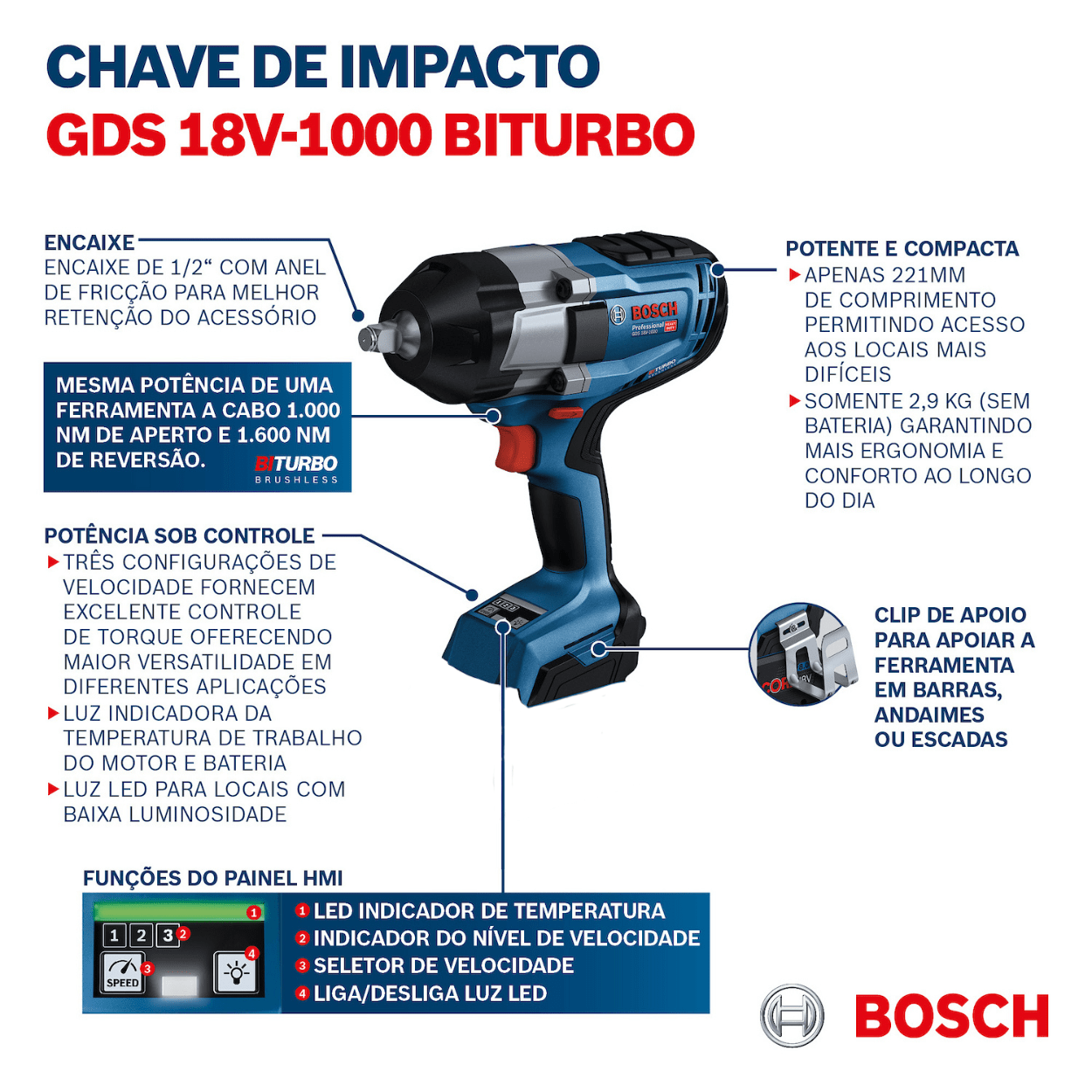 A ferramenta também possui três ajustes de velocidade e torque, permitindo versatilidade e adaptação a diferentes tipos de trabalho com controle preciso.