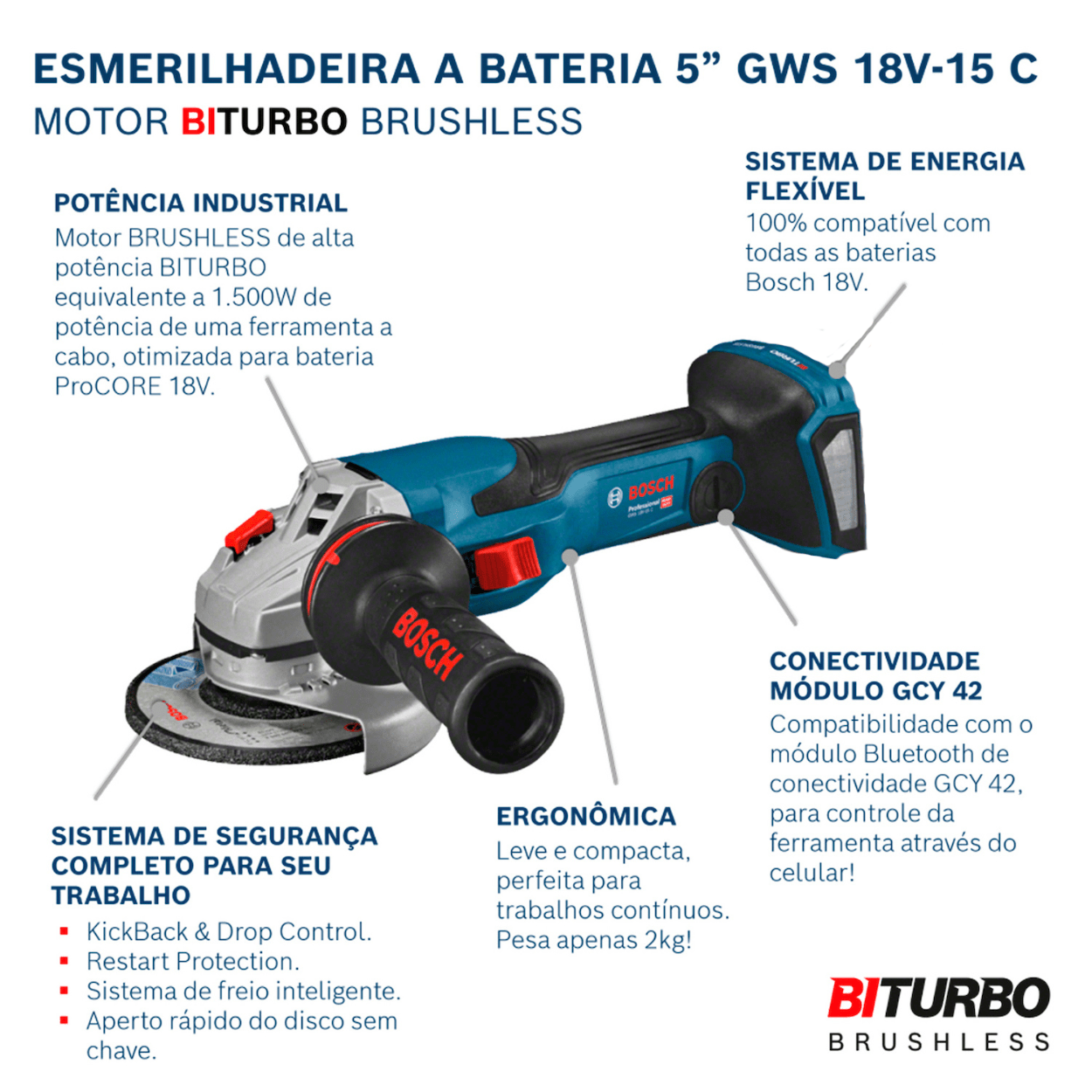 A GWS 18V-15C Professional possui motor brushless de alto rendimento, garantindo potência constante, maior vida útil e menor necessidade de manutenção. Seu desempenho atende com eficiência trabalhos em metal, aço, inox e materiais de construção, oferecendo controle preciso mesmo em aplicações mais exigentes.