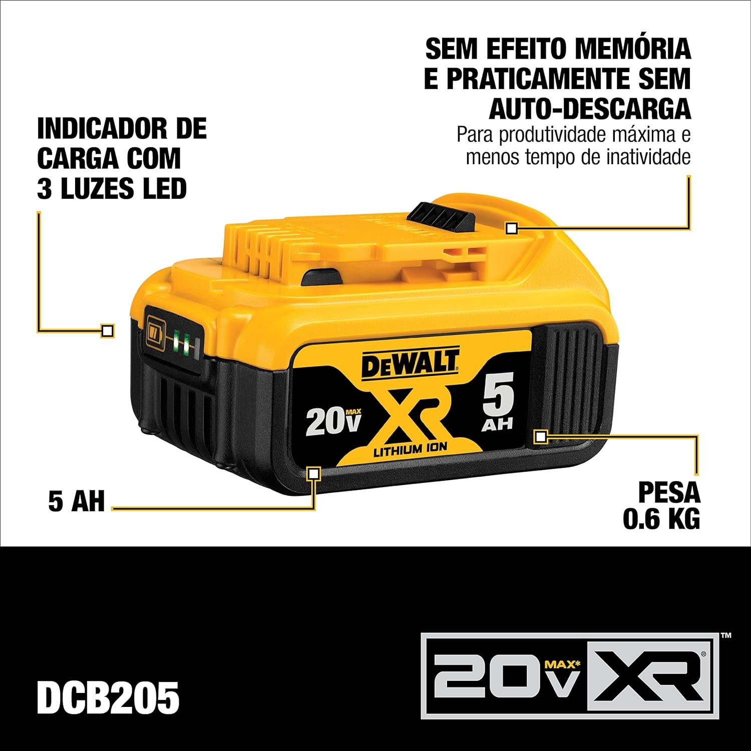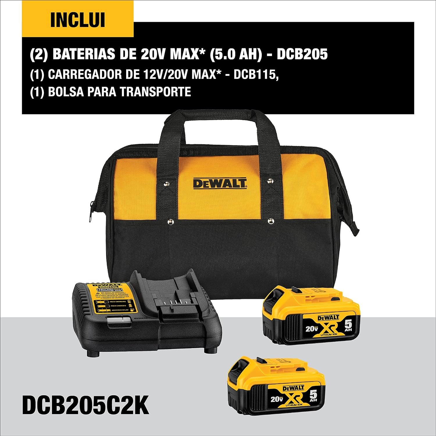O kit é composto por 02 baterias de 5Ah, 01 carregador bivolt e 01 bolsa para transporte. As baterias são livre do efeito memória, contém indicador de 3 LEDs, que permite o controle imediato do nível de carga da bateria. Compatíveis com os carregadores DCB107-B3, DCB1106-B3, DCB115-B3, DCB118-B3 e DCB104.