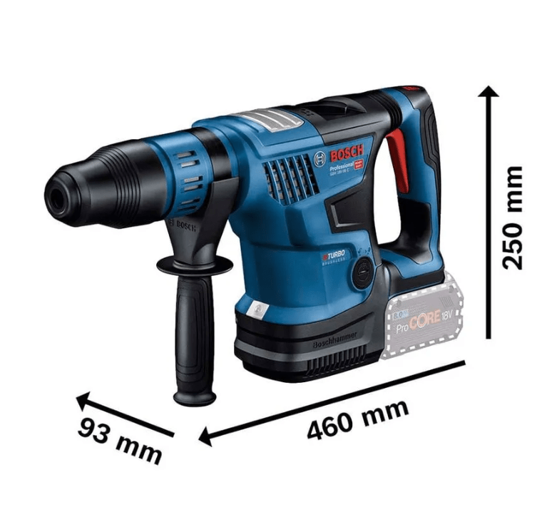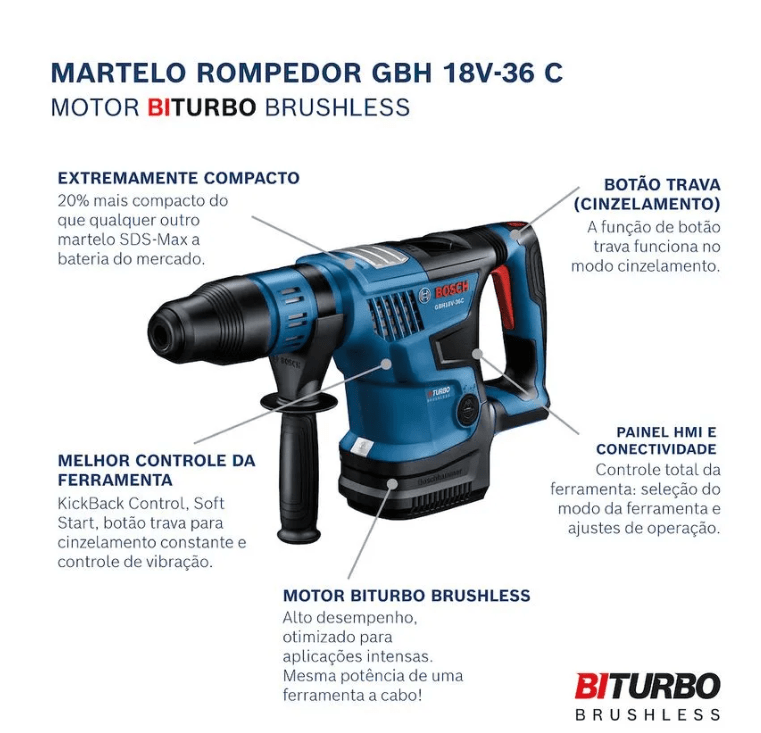 O Martelo Perfurador Rompedor a bateria Bosch GBH 18V-36 C BITURBO Brushless 18V tem a mesma potência de um Martelo Perfurador Rompedor a cabo! Seu motor BITURBO Brushless tem alto desempenho e é otimizado para extrair todo potêncial da melhor bateria do planeta - ProCORE 18V Bosch. O Martelete Bosch GBH 18V-36 C BITURBO possui interface HMI e Conectividade, onde é possivel selecionar o modo de uso da ferramenta, seleção de velocidade de perfuração, curva de aceleração e sensibilidade KBC. Além disso é possivel acompanhar o status da ferramenta em tempo real pelo aplicativo do celular, monitorando a temperatura durante o uso e nível da bateria. Ferramenta 100% compatível com todas as baterias e carregadores Bosch 18V! Esta versão vem sem bateria e sem carregador, em maleta.