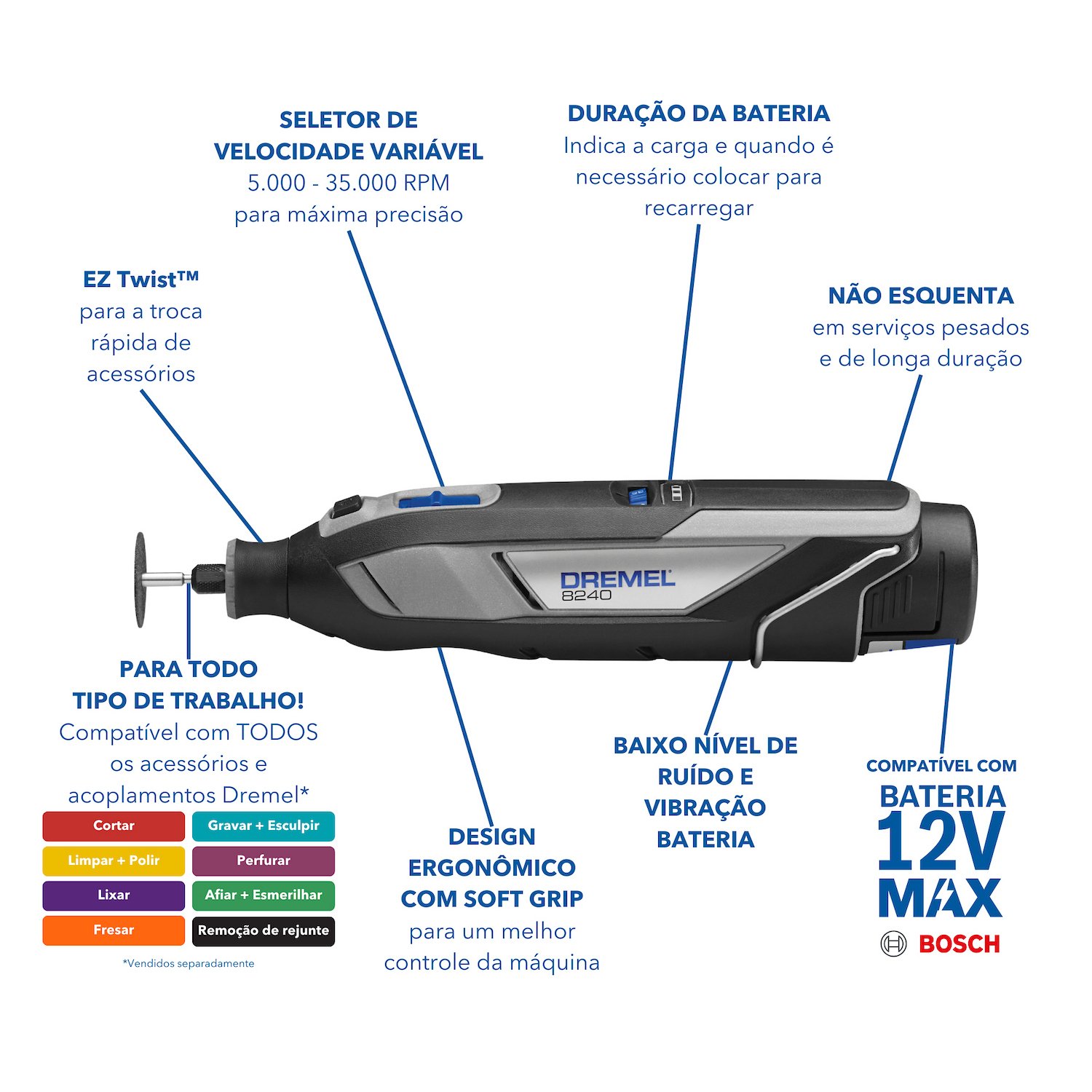 A Dremel 8240 é uma ferramenta rotativa sem fio que combina potência com portabilidade; Oferece versatilidade, a Dremel 8240 é uma ferramenta multifuncional que se adapta a diversas tarefas como: Cortar, perfurar, lixar, fresar e muito mais; Mesmo sendo sem fio, ela não sacrifica a potência; Oferece o mesmo desempenho que modelos com fio, permitindo realizar trabalhos exigentes; O design ergonômico com corpo macio de borracha garante um manuseio confortável e preciso, reduzindo a fadiga durante o uso prolongado; Os indicadores LED informam a duração restante da bateria, permitindo planejar seus trabalhos com antecedência; Ideal para quem precisa de uma ferramenta que possa ser levada para qualquer lugar.