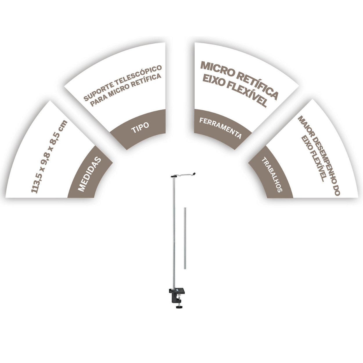 Projetado para melhorar significativamente a experiência de uso, o suporte reduz o peso percebido do veio flexível, criando uma sensação de leveza que aumenta o controle, a manobrabilidade e o conforto em aplicações de precisão. Além disso, o porta-ferramentas dedicado ajuda a organizar o ambiente de trabalho, mantendo ferramenta, cabo e acessórios essenciais sempre em um único local.